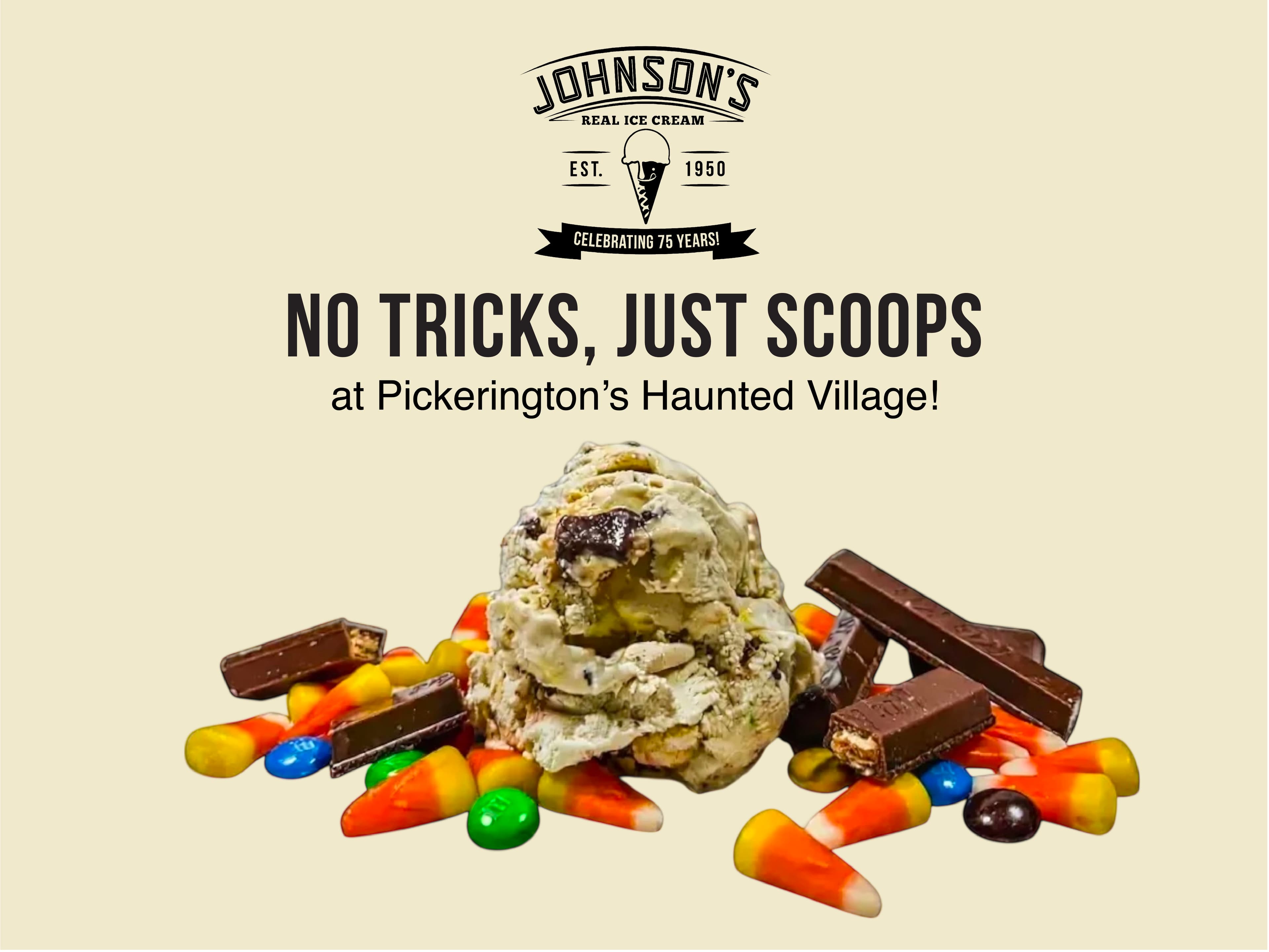 Join us at Johnson’s Real Ice Cream in Pickerington during the Haunted Village celebration on Thursday, October 23 from 6–8 p.m. Kids in costume receive a FREE Jr. Scoop of our Trick or Treat ice cream — a spooky-sweet flavor packed with candy surprises!