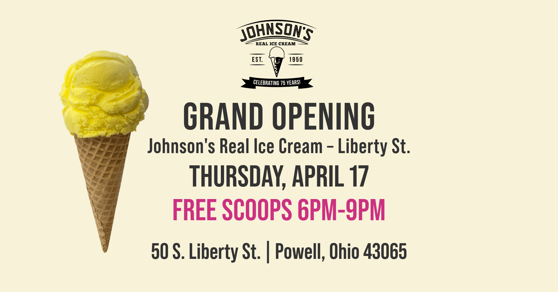 POWELL, Ohio (March 27, 2025) – Central Ohio's beloved Johnson's Real Ice Cream is excited to announce the grand opening of its second Powell location at 50 S. Liberty St. on Thursday, April 17. This new shop marks the second of three store openings planned for 2025, aligning with the 75th anniversary of the fourth-generation, family-owned company.