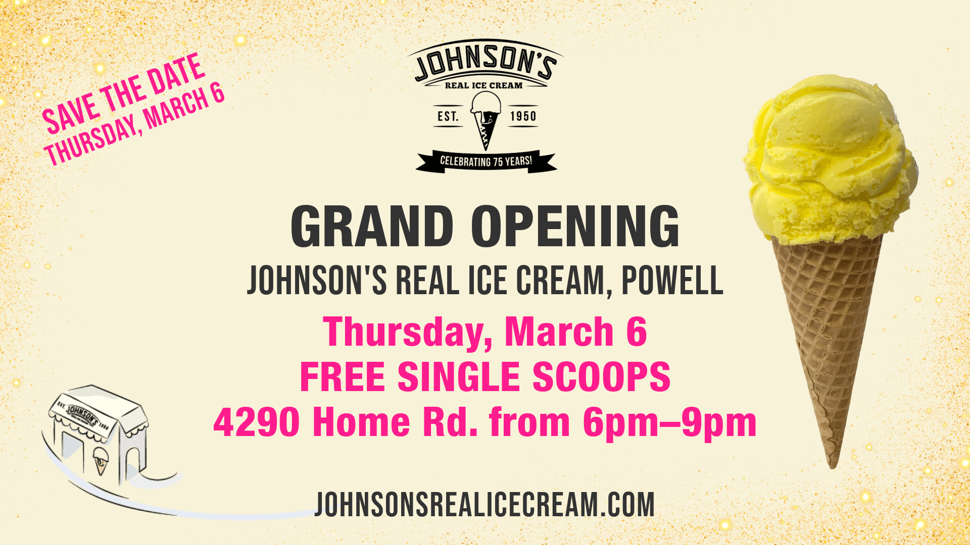 To commemorate the occasion, doors will open to the public at 6 p.m., and Johnson’s Real Ice Cream will offer free single scoops to guests at the Powell location from 6 p.m. to 9 p.m. Each guest can enjoy a complimentary scoop of their favorite flavor. Additionally, the first 50 customers will receive a free limited-edition 75th anniversary t-shirt. Throughout the evening, attendees can also look forward to surprise giveaways.